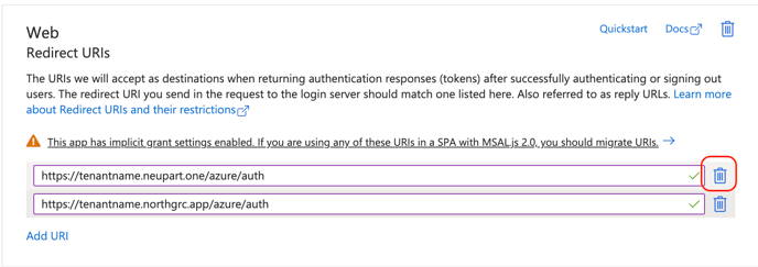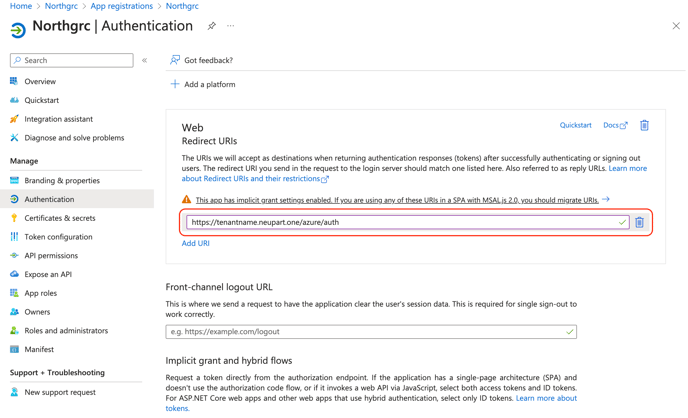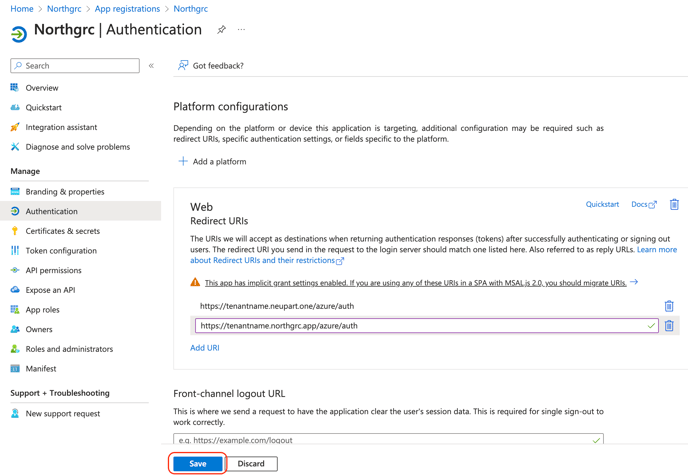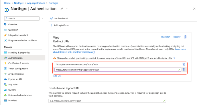 Her skal i tilføje en ny redirect URL der hedder https://tenantname.northgrc.app/azure/auth så i nu har minimum to redirect URL's stående.