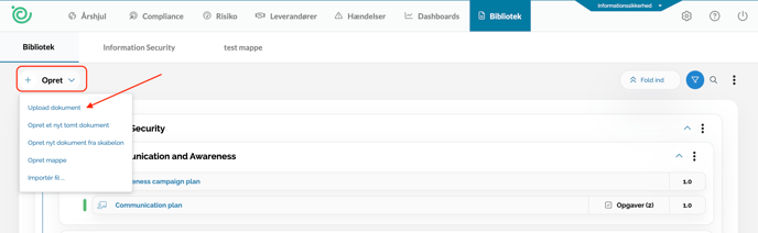 Upload af dokumenter kan gøres ved at klikke på +opret > Upload dokument: