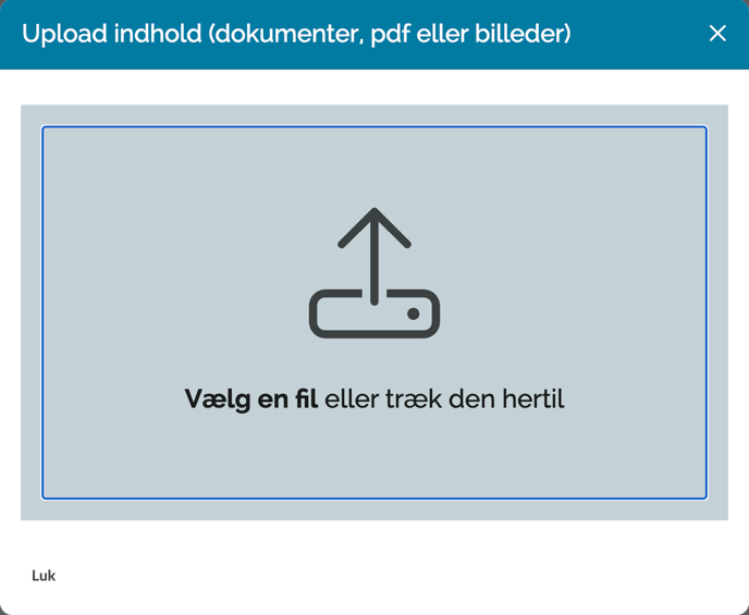 Herefter vil der åbne et nyt upload vindue, hvor det er muligt enten at trække og slippe et dokument hen på feltet, eller klikke på feltet, hvorefter stifinderen bliver åbnet. Her kan i vælge eller flere filer der skal uploades: