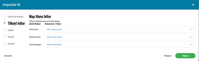 Felterne Organisation og feltgrupper skal udfyldes manuelt på aktiverne efter importen.