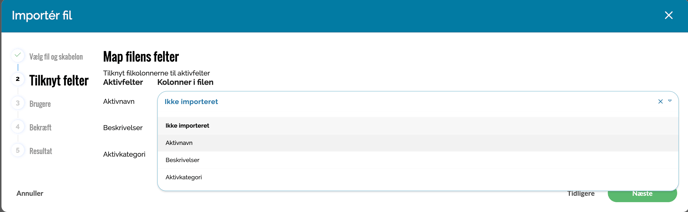Der er en dropdown ud fra hvert aktivfelt. Her kan i vælge hvilken information fra excel arket der skal stå hvor. Det er også her at navnene på kolonnerne i excel arket kan ses: