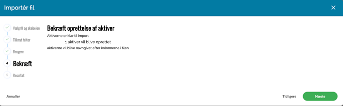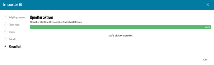 Når i klikker på 'Næste' vil aktiverne blive oprettet og i vil kunne se hvor mange aktiver der bliver oprettet: