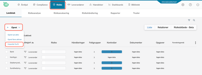 Import af aktiver udføres under Risiko → Landskab → Opret → Importér fra fil: