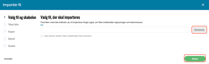 Nu skal i vælge den fil i gerne vil importere aktiver fra, det gør i ved at klikke på 'Gennemse', vælge excel filen der skal importeres aktiver fra og herefter klikke på 'næste':