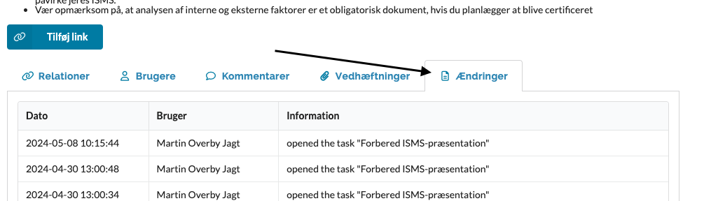Kan jeg se hvilke ændringer der er foretaget? Ja, alle ændringer er logget og kan ses under Indstillinger > System > Logs > Audit-log. På nogen entiteter, som fx opgaver, kan man i bunden se ændringer specifikt for opgaven. Se eksempel herunder: