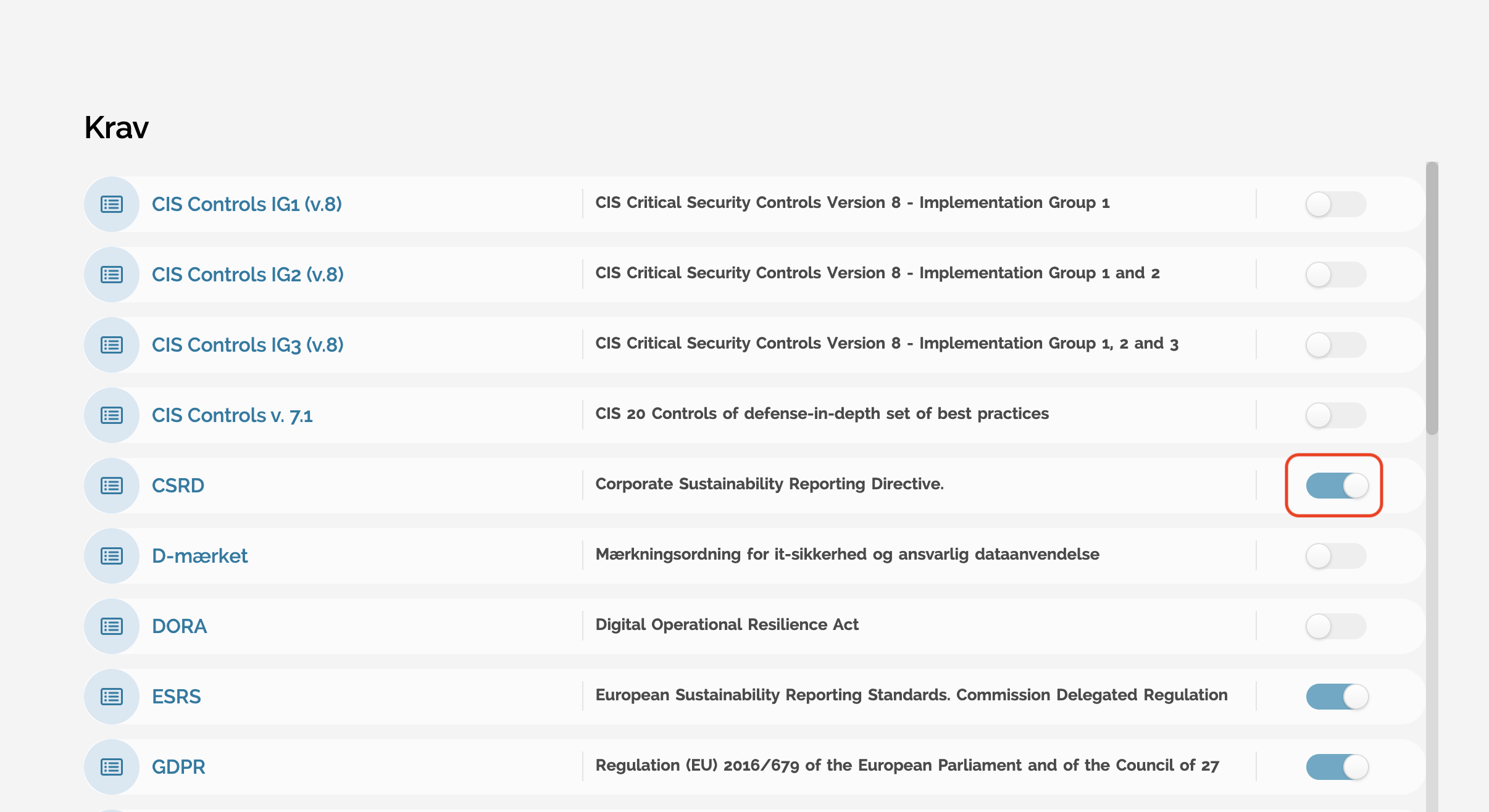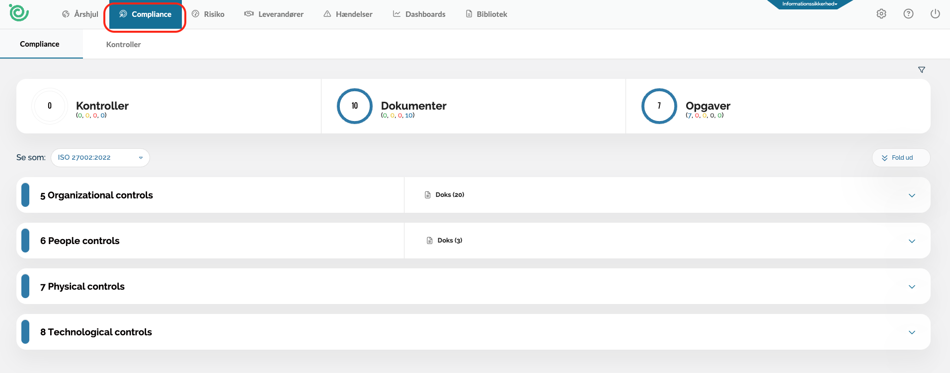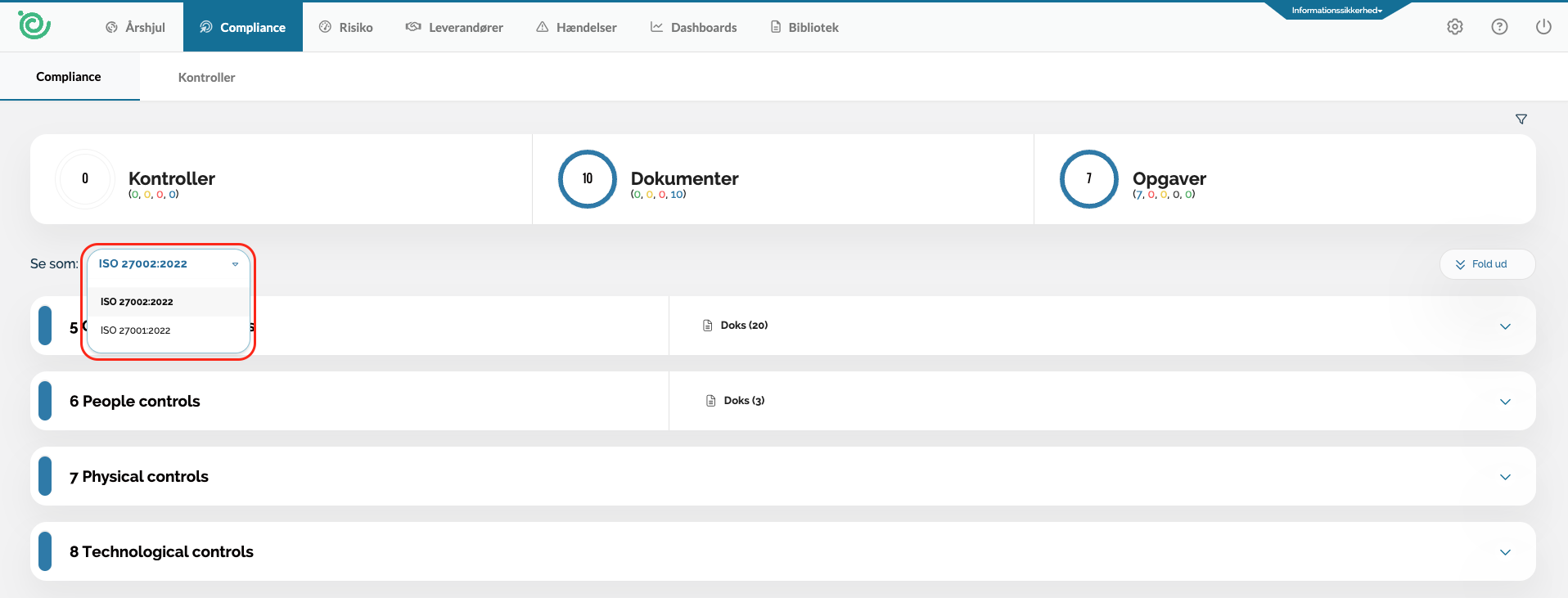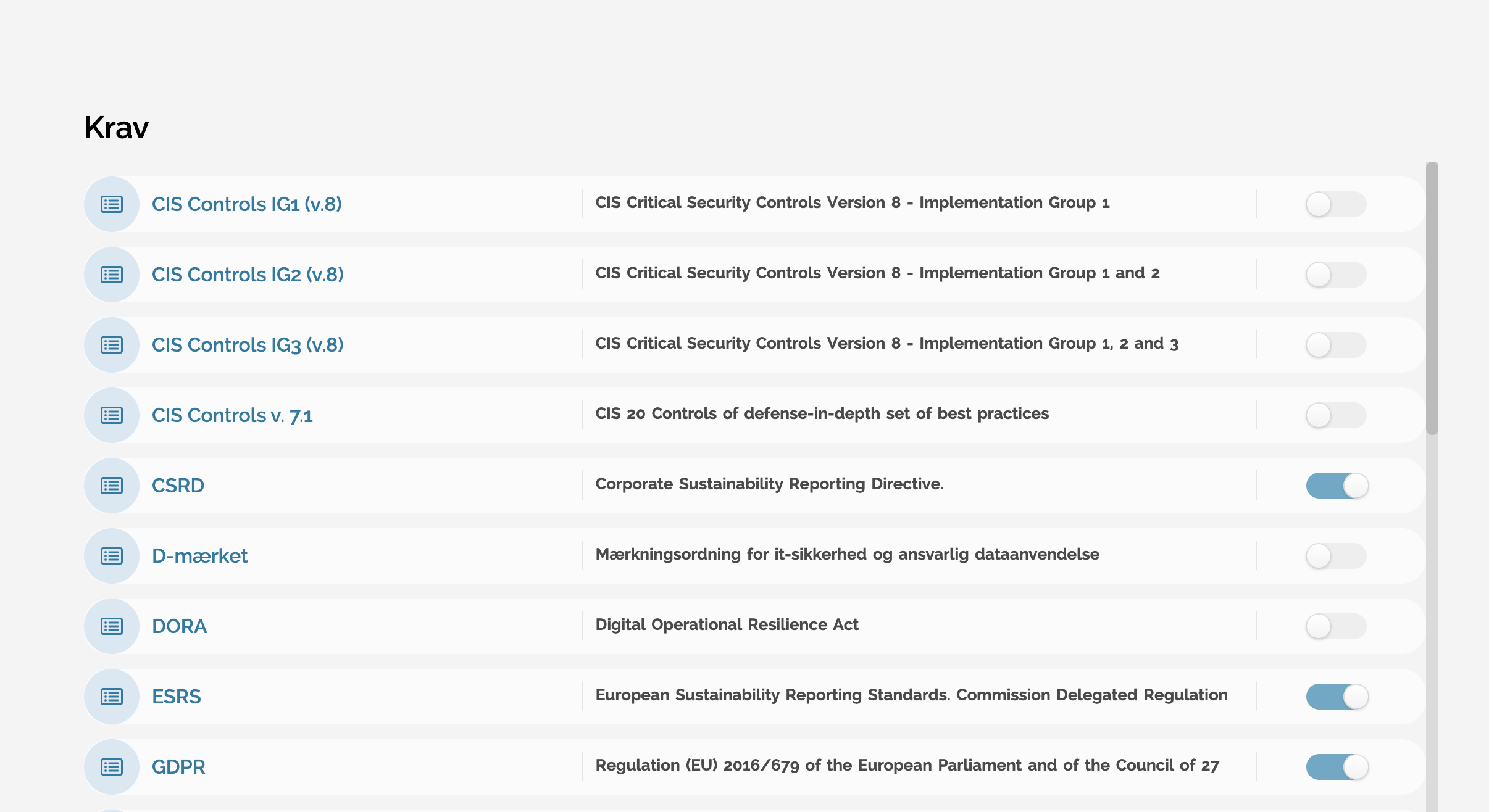 Hvilke standarder der vises under Krav kommer an på hvilke workbenches i har adgang til i jeres system. Hver workbench har bestemte standarder tilknyttet, fx vises ISO 27001 og 27002 kun under Informationssikkerhed, og GDPR vises kun under Databeskyttelse.