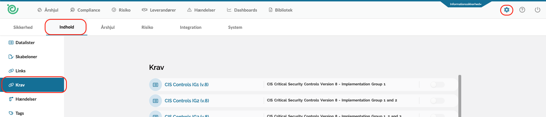 Får at slå flere standarder til skal vi ind i Indstillinger → Indhold → Krav: