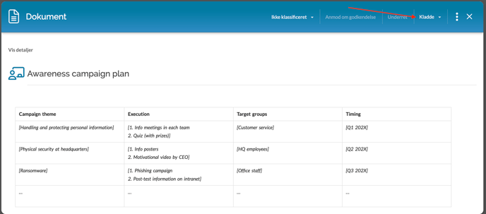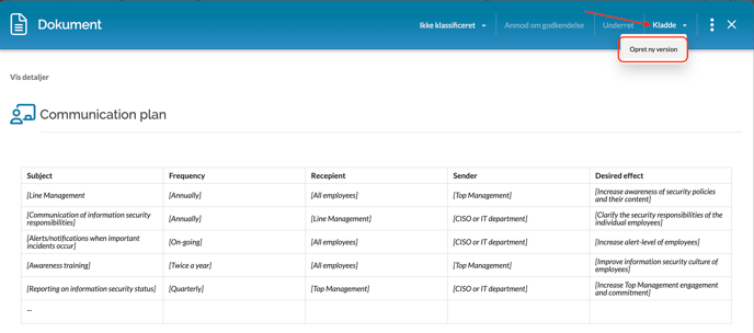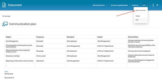 Kladden er den første "version" af dokumentet, som kan redigeres. Når i er færdige med at redigere, kan i oprette en version ved at klikke på Kladde og derefter Opret ny version: