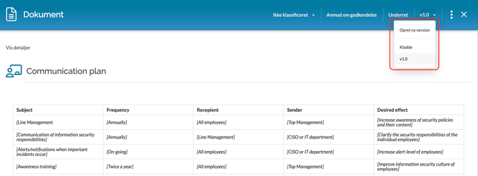 Nu er versionen oprettet. Versioner af dokumenter kan ikke redigeres, hvis i ønsker at redigere dokumentet yderligere skal i navigere tilbage til kladden. Ændringerne i laver kommer ikke med i version 1.0, men vil komme med i den næste version i opretter. Derfor er det også en god ide ikke at oprette en version, før i er sikre på at dokumentet ikke skal redigeres mere.