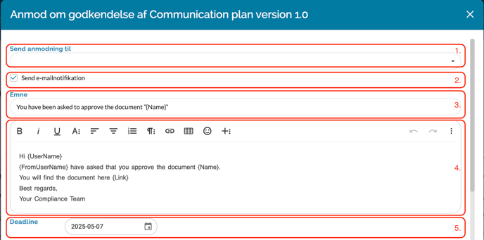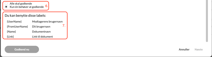 2. Skal personen modtage en email notifikation på, at de er blevet bedt om at godkende et dokument. Hvis fluebenet fjernes, vil notifikationsfeltet forsvinde.