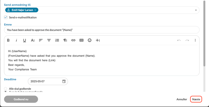Personen/personerne der er blevet bedt om at godkende dokumentet vil modtage en notifikation herom på mail: