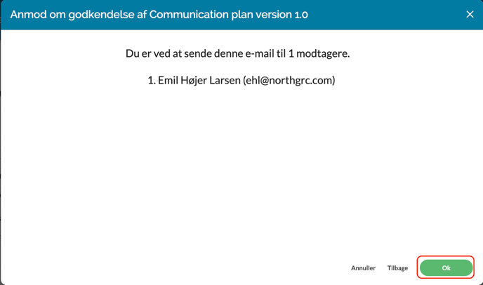 Herefter vil i få en liste over hvem der vil blive bedt om at godkende dokumentet. Dobbelttjek om det er de rigtige personer, eller om der mangler nogle før i klikker på ok for at udføre anmodningen: