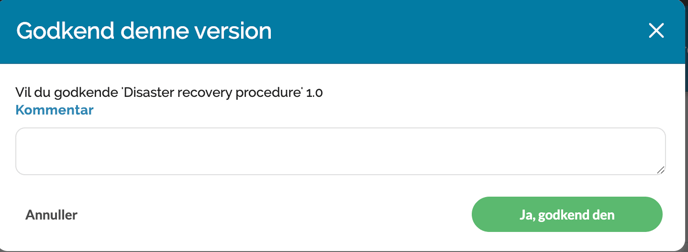 Den sidste knap i bunden af skærmbilledet der hedder Godkend nu, kan benyttes til at godkende versionen med det samme. Det kræver at man er ejer af dokumentet, eller at man har Documentmanager rollen.