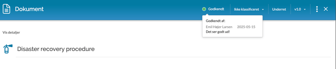 Efter godkendelsen, eller afvisningen er udført vil det fremgå øverst i dokumentet, sammen med den kommentar man har tilknyttet: