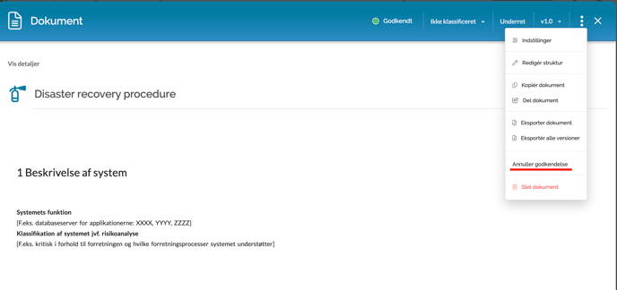 Ejeren af dokumentet eller brugere med documentmanager rollen kan altid annullere godkendelsen af dokumentet ved at klikke på de tre prikker i hjørnet: