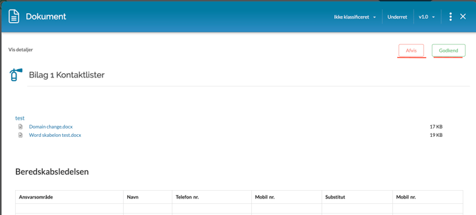 Når godkenderen åbner dokumentet vil de se at de har muligheden for enten at afvise eller godkende dokumentet: