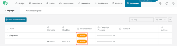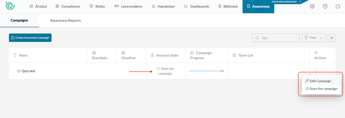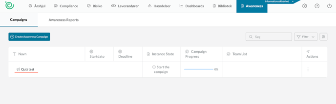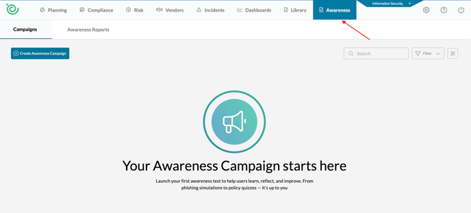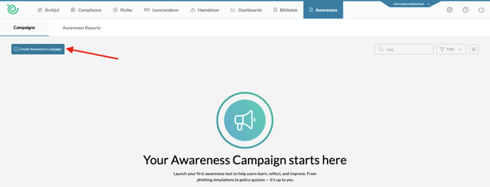 When you're in the awareness module, you will see the Create Awareness Campaign button in the top left corner. Click this button to start creating your awareness campaign.