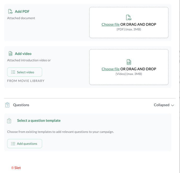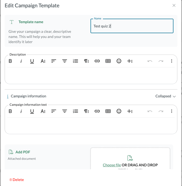 If you have created your own template or want to edit an existing one, you will be presented with the following window, where you can add more information to the template: a PDF, a video, or an existing question template:
