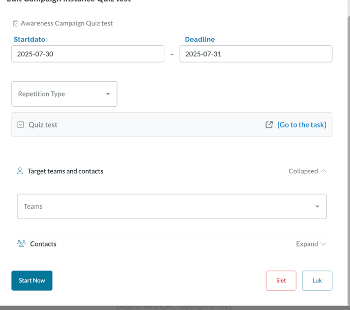 I choose to start it, after which we will be asked to enter a start and end date, select which teams the campaign should be sent to, and specify the contact persons for the campaign: