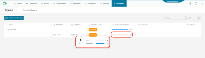 After that, you can submit your answers. Once all users have completed the quiz, the campaign will be marked as 100% completed, and you will be able to see how many responses have been recorded: