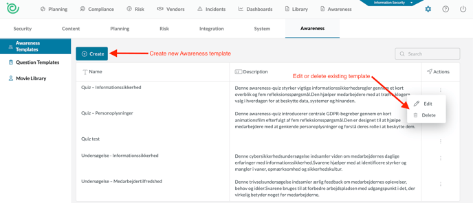 In this tab, you will find the quizzes and surveys that are available by default in NorthGRC, as well as the ones you have created yourselves. These are the items you send out to the individuals who are to complete a quiz or take a survey. In the same window, you can create new templates and edit the existing ones: