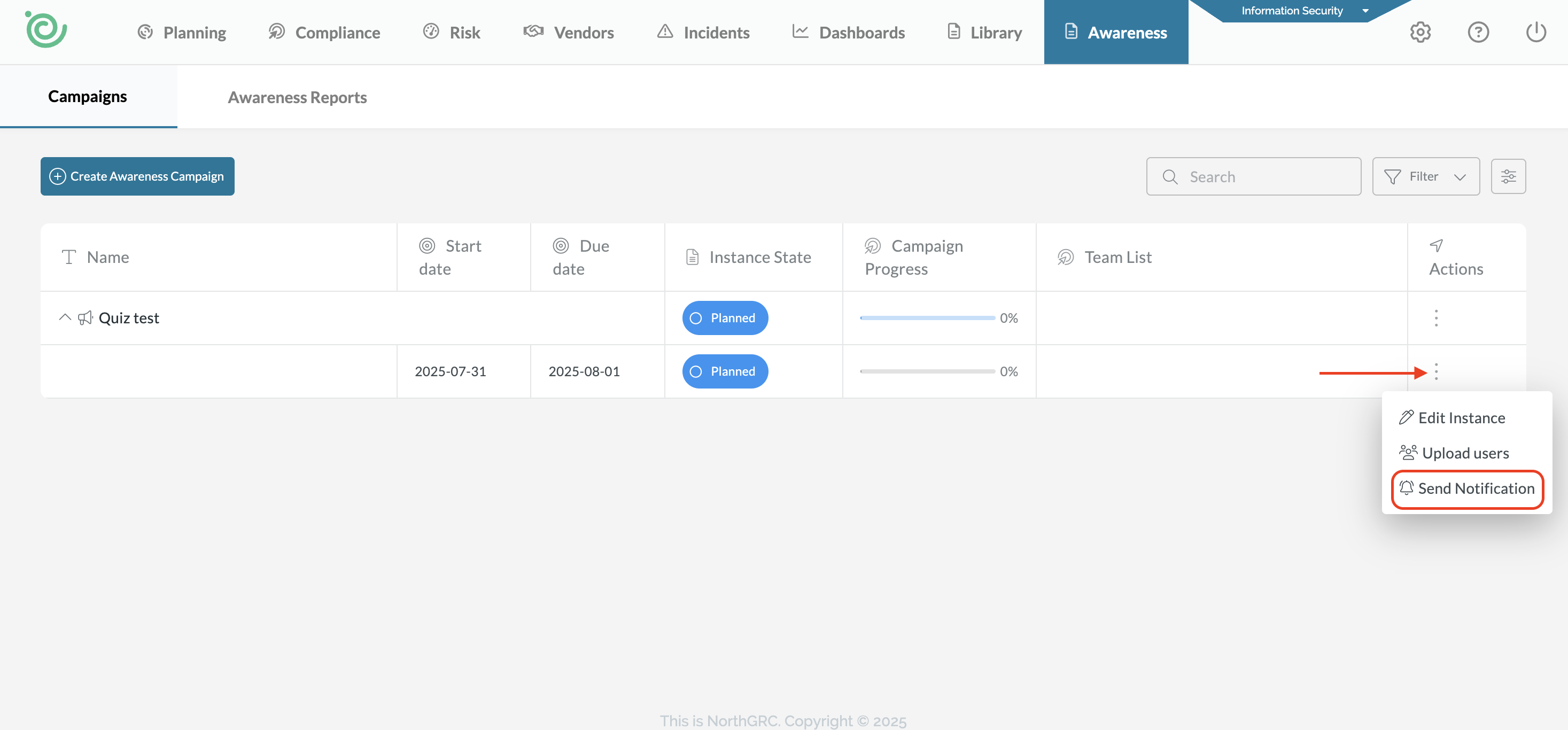 In NorthGRC, we have developed a new awareness module that you can use to send awareness campaigns to your colleagues.