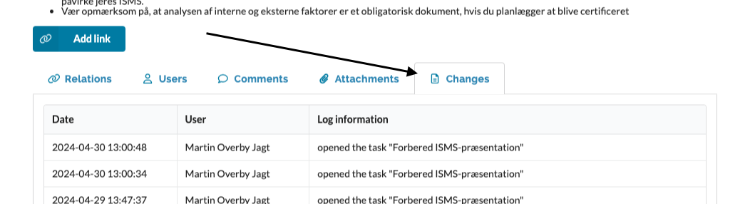 On some entities, such as tasks, you will be able to find changes made directly in the bottom of the specific task. See below for an example: