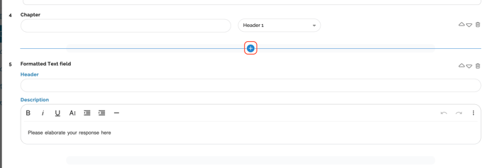 You have the option to add new fields to the template by hovering between existing fields, where a small blue plus sign will appear. Simply click on it to add a new field: