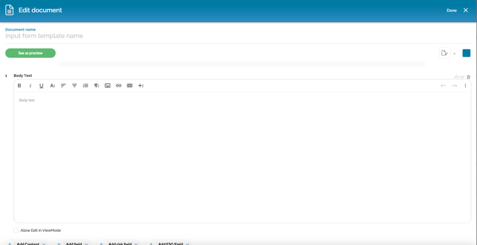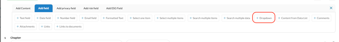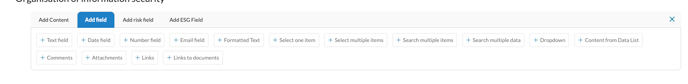 Here you have the option to add additional fields, which are divided into the following categories: Add Content, Add Field, Add Risk Field, and Add ESG Field.