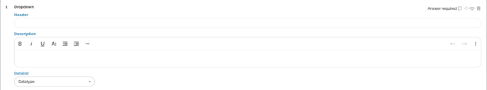 When dropdown is selected, you need to fill in a heading, a description of the dropdown menu (this is optional), and finally select the dropdown you have just created under Data Lists.