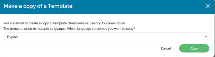 If you would like to base you questionnaire on an existing questionnaire, you can copy an existing questionnaire by clicking the copy icon on the right side of the Template bar, where you will then need to select which language the copy should be copied in.