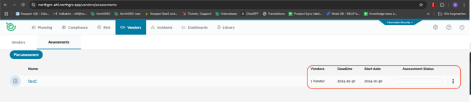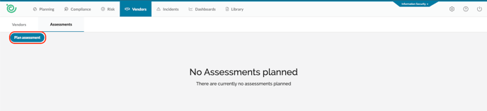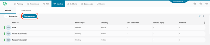 In the supplier module in NorthGRC, you get an overview of all your suppliers. You will see two different tabs: 'Vendors', and 'Assessments'. If you wish to evaluate a supplier, click on 'Plan assessment' at the top of one of the tabs.