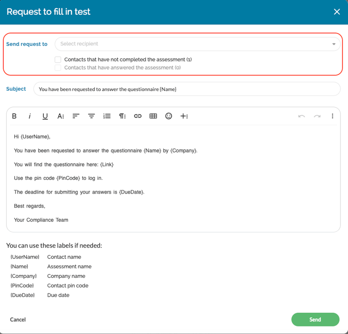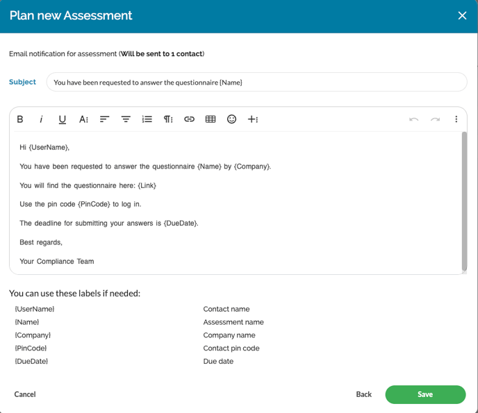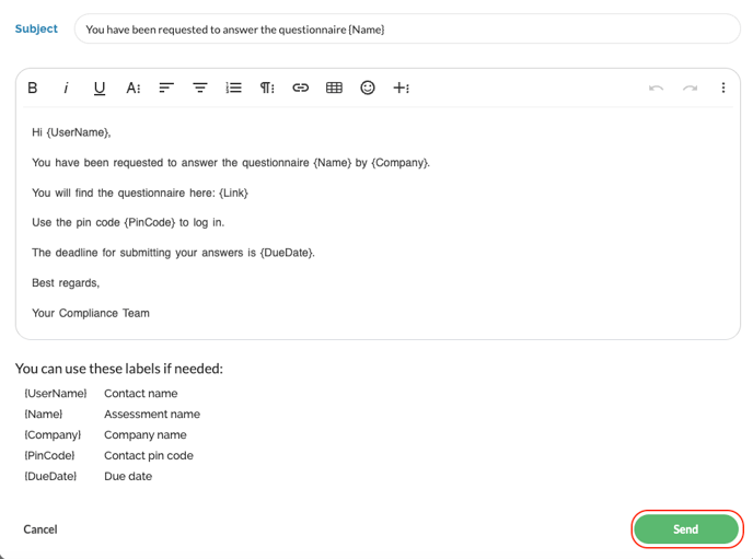 At the bottom of the window, you'll find a list of labels you can use in the email. These labels allow you to insert information for the supplier, such as the deadline, Assessment name, contact person’s name, and more.