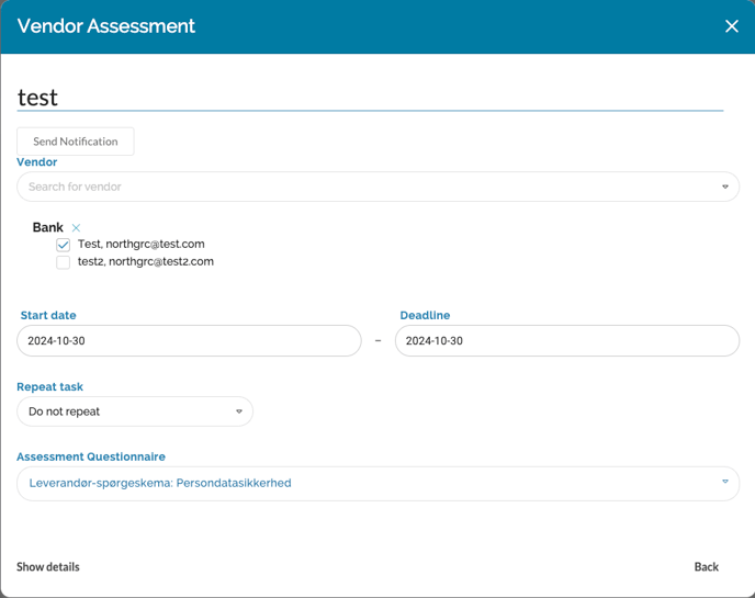 Once you have selected the vendor, a list of the contact person(s) associated with that vendor will appear. Here, you choose the contact person who should receive the questionnaire by email. If you are responsible for the the vendor you are assessing, you can also choose yourself as the person who will carry out the assessment. This will also create a task within the annual cycle.
