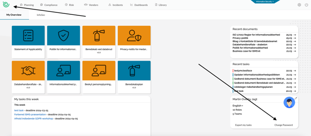 To change your current password, go to the homepage overview in the top left corner.