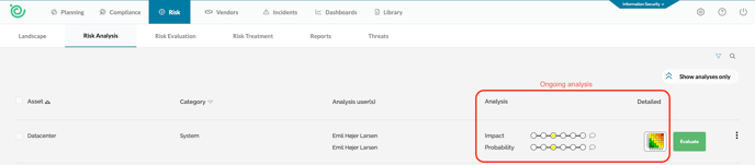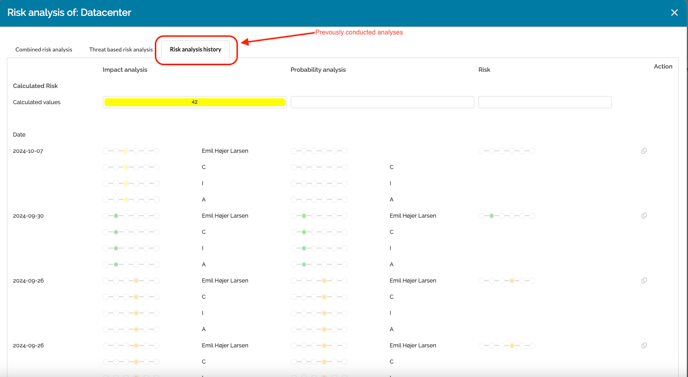 To access previously conducted risk analyses, you need to click on the Heatmap located under 'Details' in the analysis bar, and open the tab Risk analysis history.