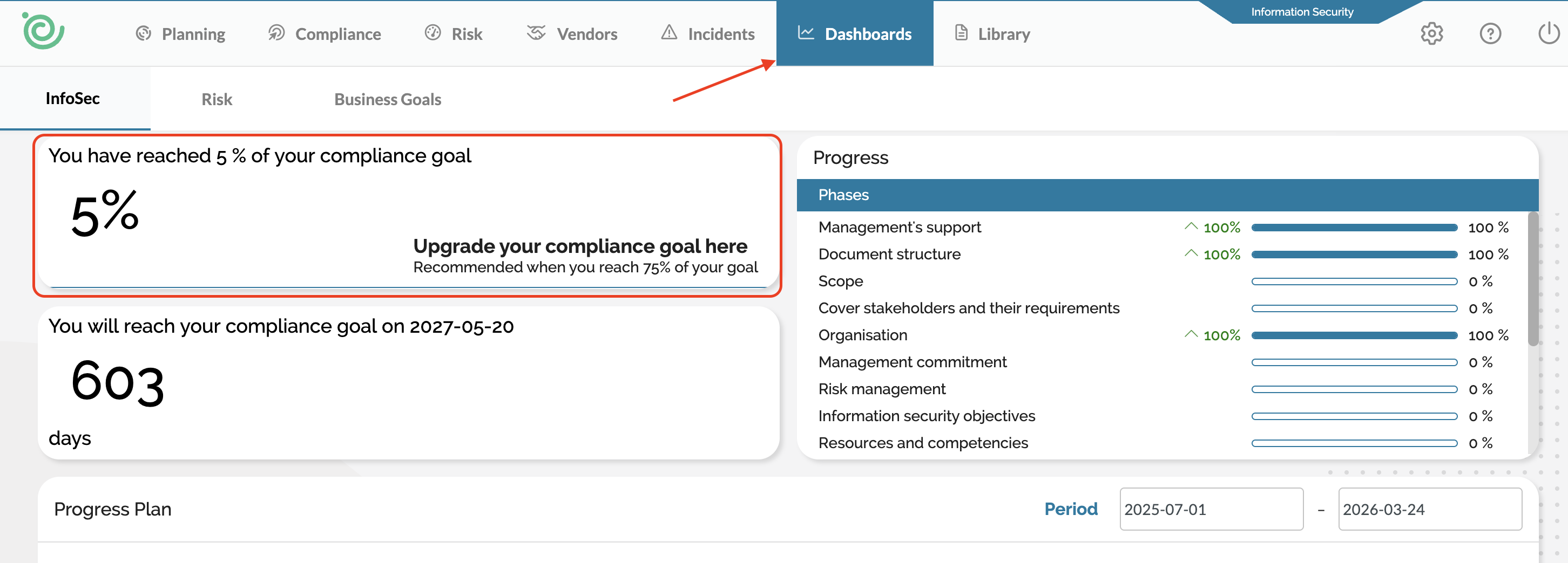 The compliance percentage is also displayed at the center of your planning wheel, reflecting the same value as shown on the dashboard: