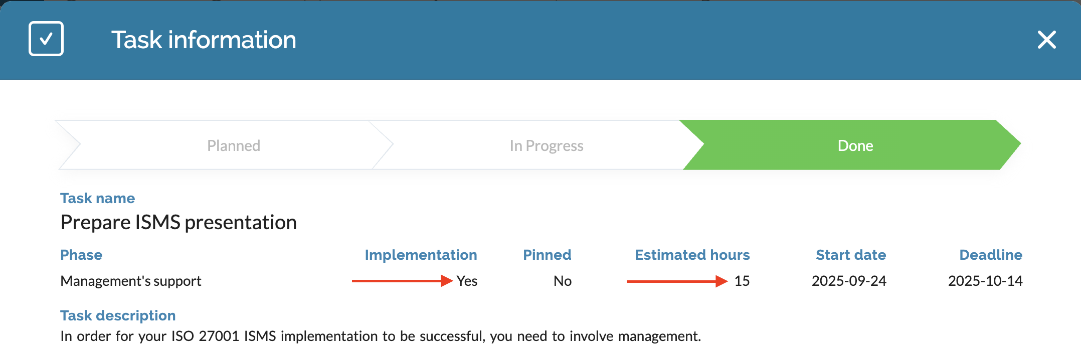 When an implementation task or a recurring task with estimated hours exceeds its deadline, these work hours will be deducted from your compliance percentage. Although recurring tasks are not included in the completed compliance percentage, they will still count against, if their deadline is exceeded. The reason for this is that recurring tasks are designed as maintenance tasks. If they are exceeded, it indicates that something in your ISMS has not been maintained, and this is reflected in the compliance percentage by subtracting the estimated hours from the overall compliance %.