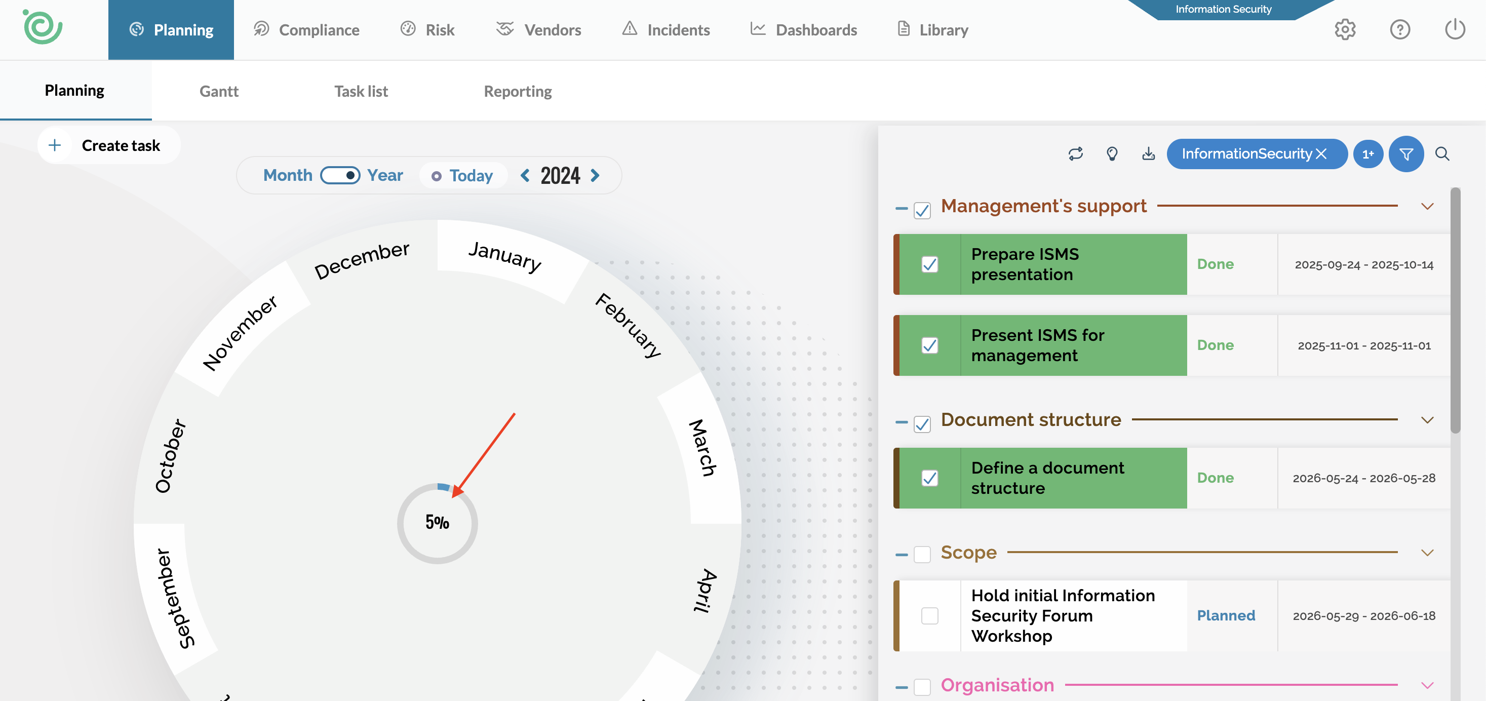 The compliance percentage is calculated based on the completed tasks found in the planning wheel, minus the tasks that have exceeded their deadline. This is explained in detail below.