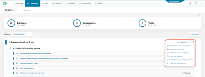 By clicking on the three dots on the right side of a main section or sub-section, you have the option to add tasks, documents, and controls. You can either create new items or add existing ones to the selected section:
