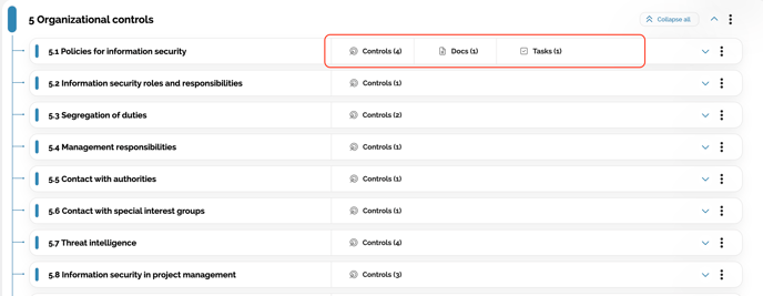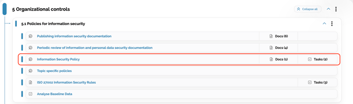 If you expand the sub-section, you will be able to see the documents and tasks related to the controls: