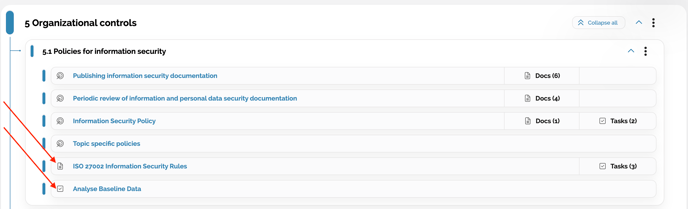 Tasks and documents that are directly related to a sub-section will appear in the same way as controls, but with their respective icons:
