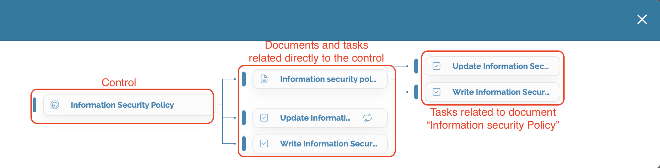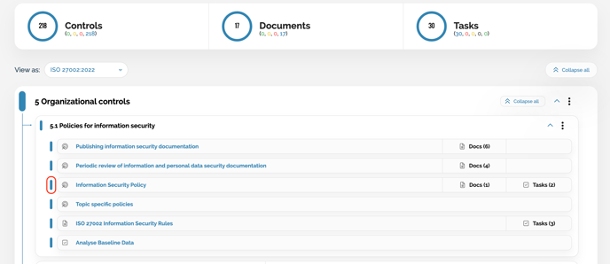 The hierarchy is a great way to keep track of whether you need to complete tasks or approve documents related to your controls and standards. Furthermore, as you can see in the image, tasks related to the documents associated with the control are also displayed. You can also check their status.