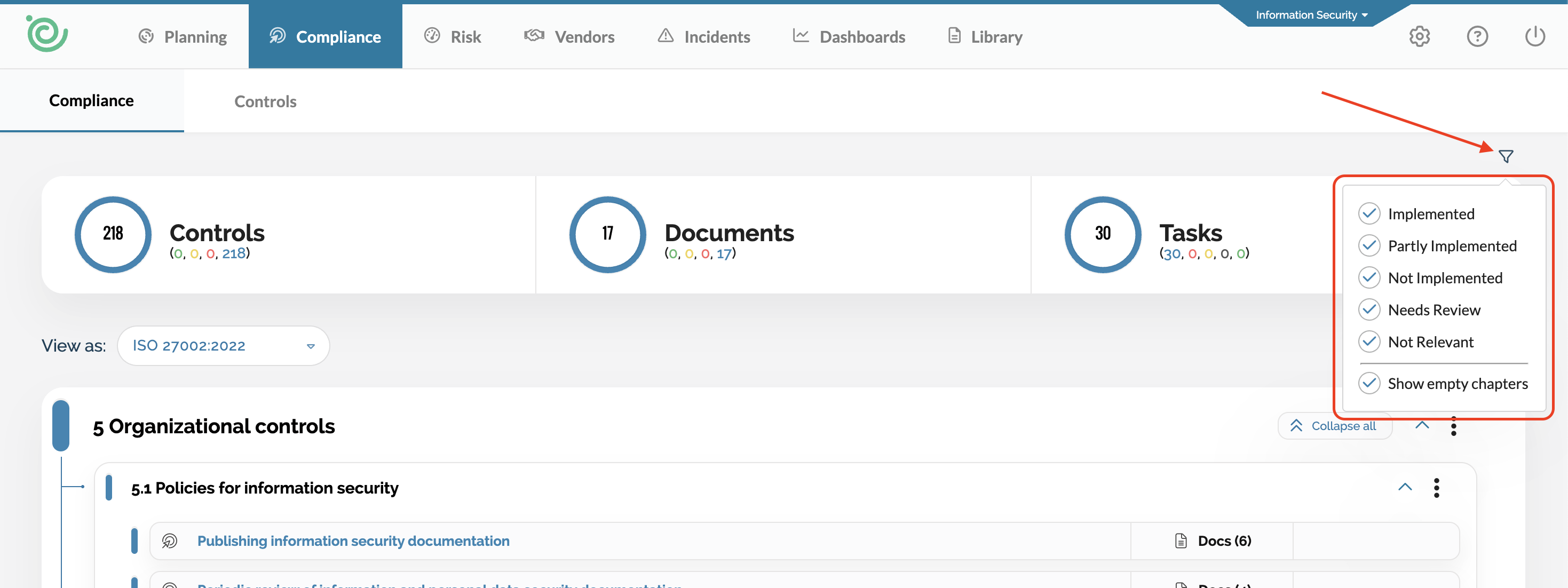 On the compliance page, you can also filter your controls so that you only see those that match the filter you have applied.