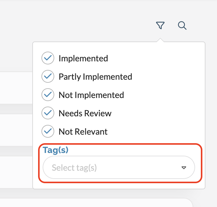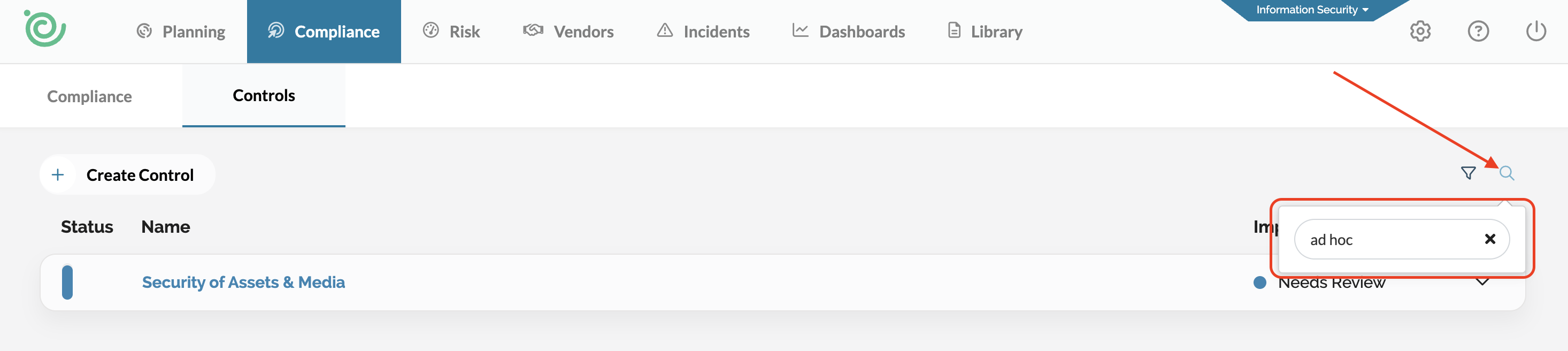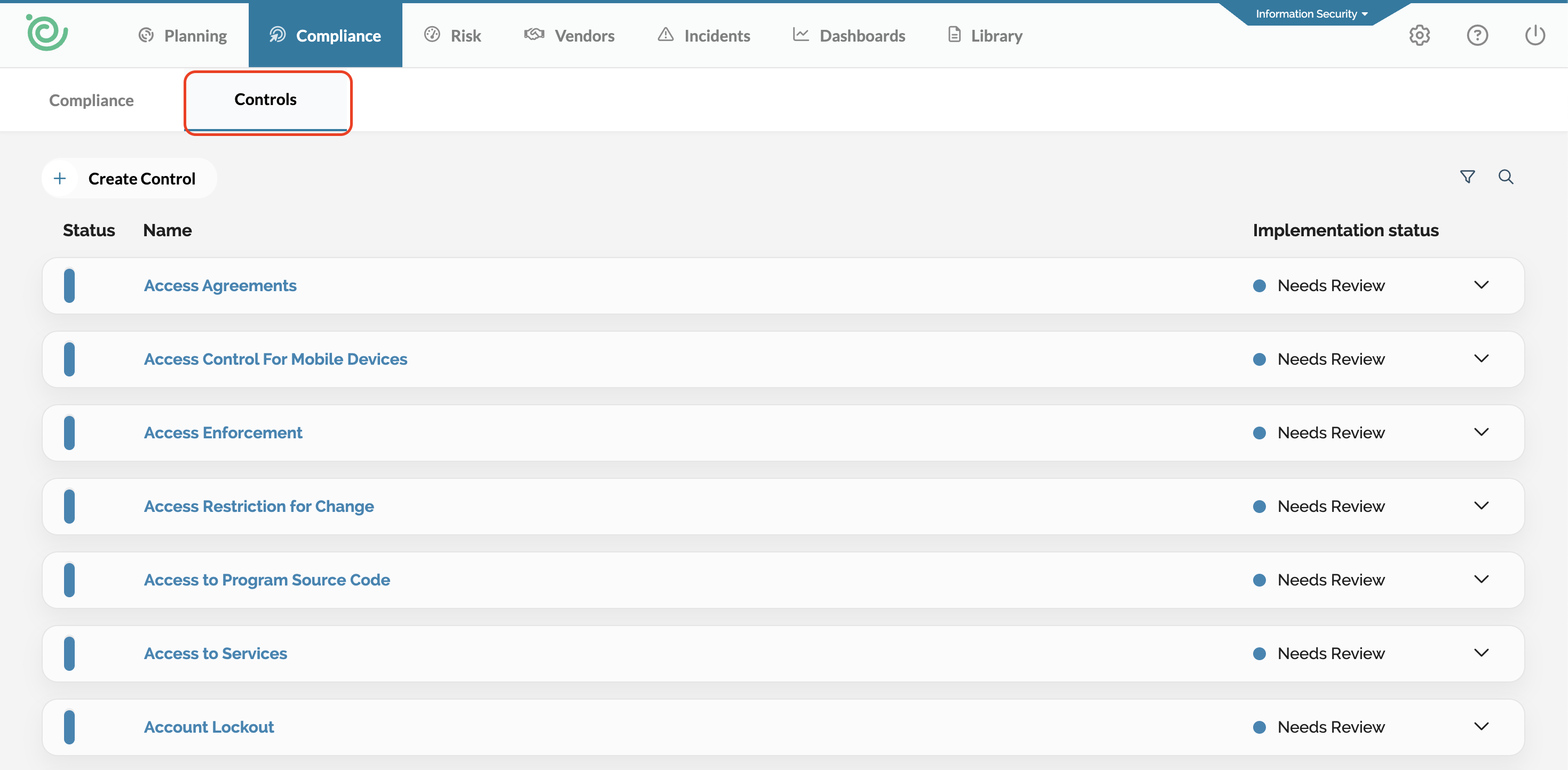 Here, you will see all controls in the system. Just like on the Compliance page, you can filter the controls by their status and sort them by tags: