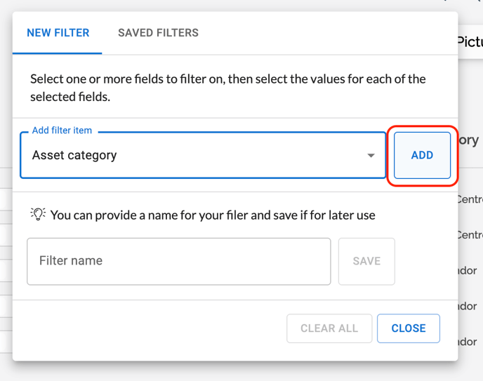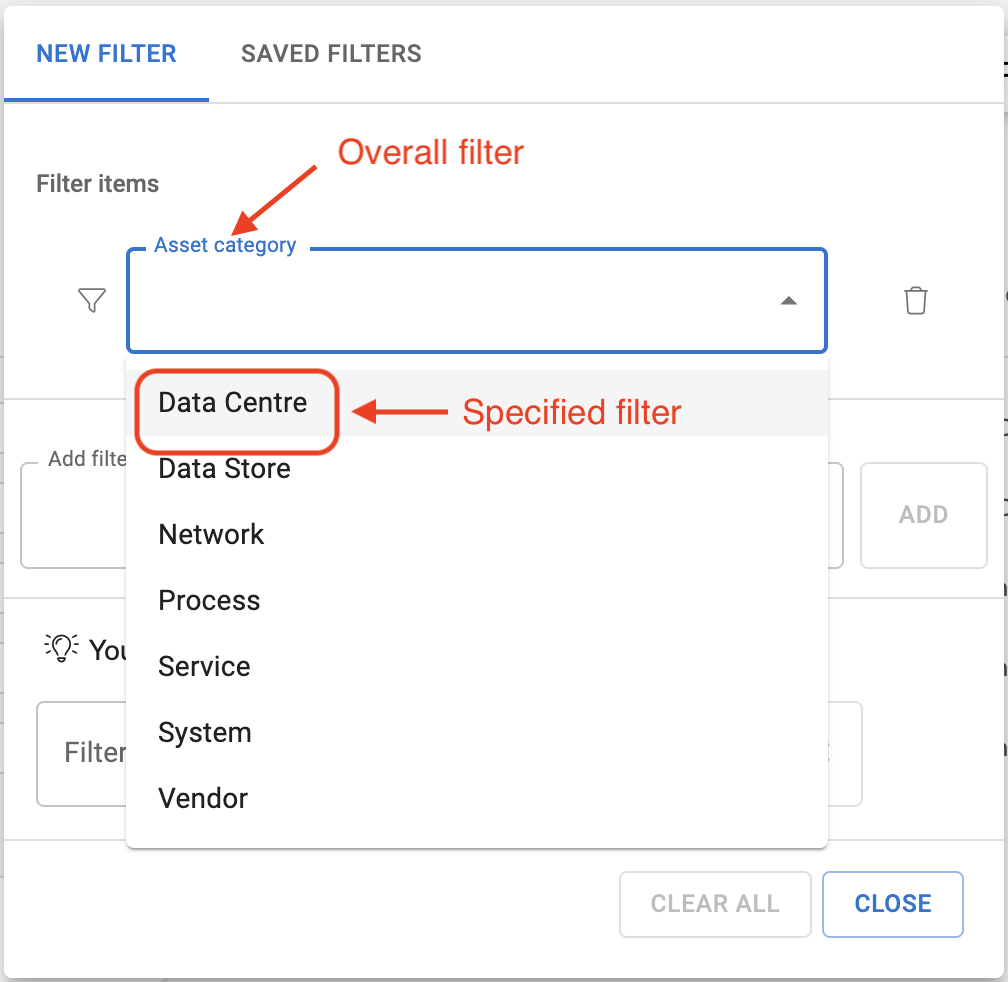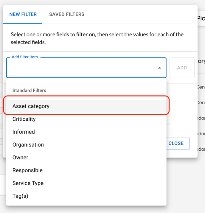 the dropdown menu called Add filter item, you can select a main filter that you want to filter by. In the example below, we use Asset Category as the main filter: