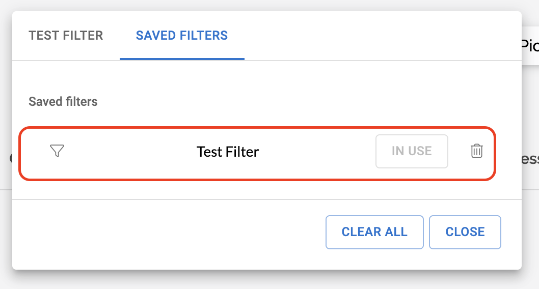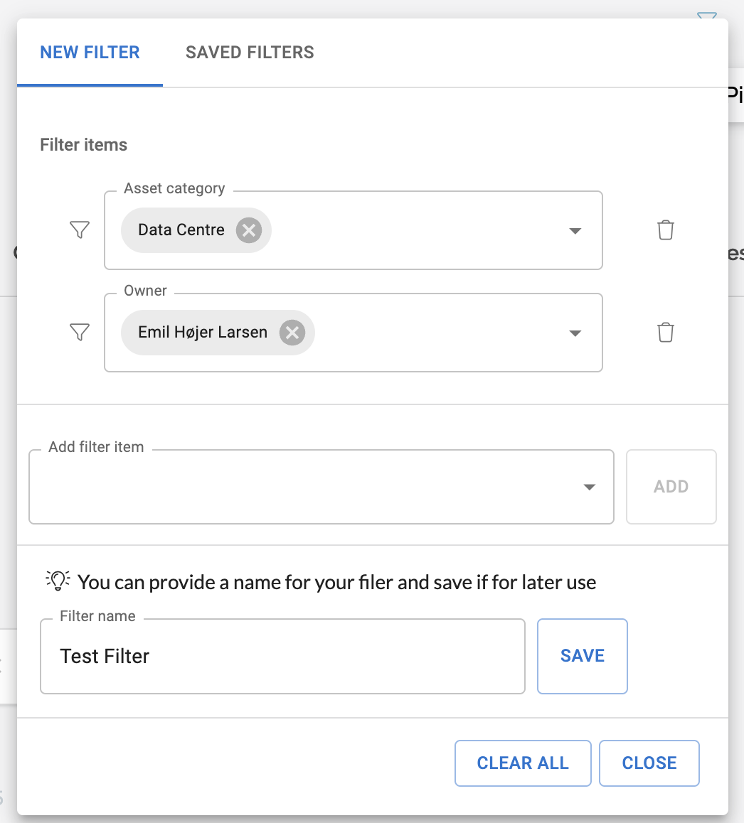 At the bottom of the filter panel, you can enter the desired name and save the filter. Once saved, it will appear under Saved Filters: