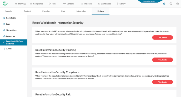 You are now able to reset individual workbenches or modules in NorthGRC to original settings and content.