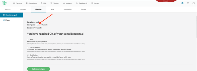 Compliance Goal Downgrade You can now reduce your compliance goal under Settings > Planning > Compliance Goal. The system will preview which tasks and documents will be removed before requiring confirmation. All you have to do is to click the slider and choose what level you want to downgrade to: