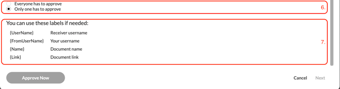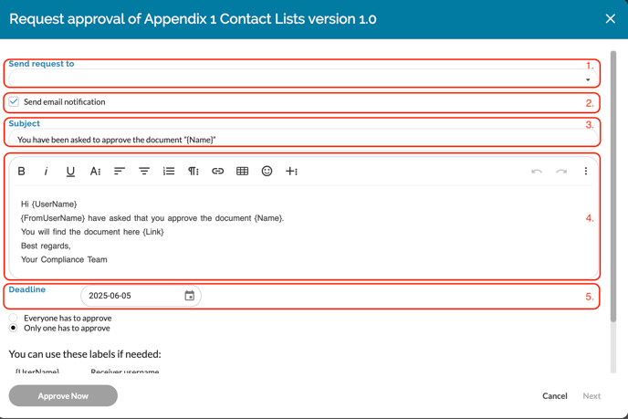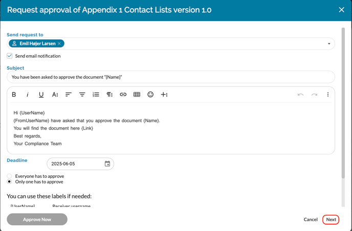 Who the approval should be sent to. You can add one or more individuals. Teams can also be added so that all team members are asked to approve the document.
